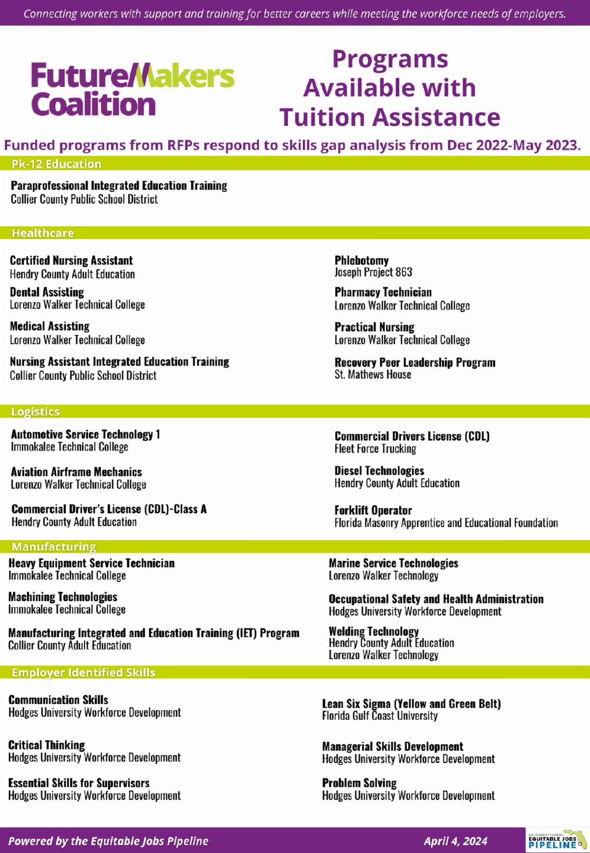 The Southwest Florida Equitable Jobs Pipeline is actively seeking employer partners in Southwest Florida who are enthusiastic about sustaining workforce development initiatives in four key sectors for both new and existing employees: PK-12 Education, Manufacturing, Logistics, and Healthcare through participation in the Equitable Jobs Pipeline. Ideally, proposals will include a well-defined strategy for the employer to gradually assume the cost of training, with the goal of achieving sustainability by December 2025.